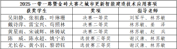 2025年11月23日,2025“一带一路”暨金砖大赛之城市更新智能建造技术应用赛项圆满收官。我院建筑电气与智能化学子由林苏敏、刘军平、姜泽、赵兵、谢汉康老师联合指导的3支参赛队伍在决赛中获全国一等奖1项、二等奖2项。在前期选拔赛中,我院9支队伍获二等奖3项、三等奖2项,此次决赛的突破,充分彰显了我院在数字建筑领域复合型人才培养的高质量。