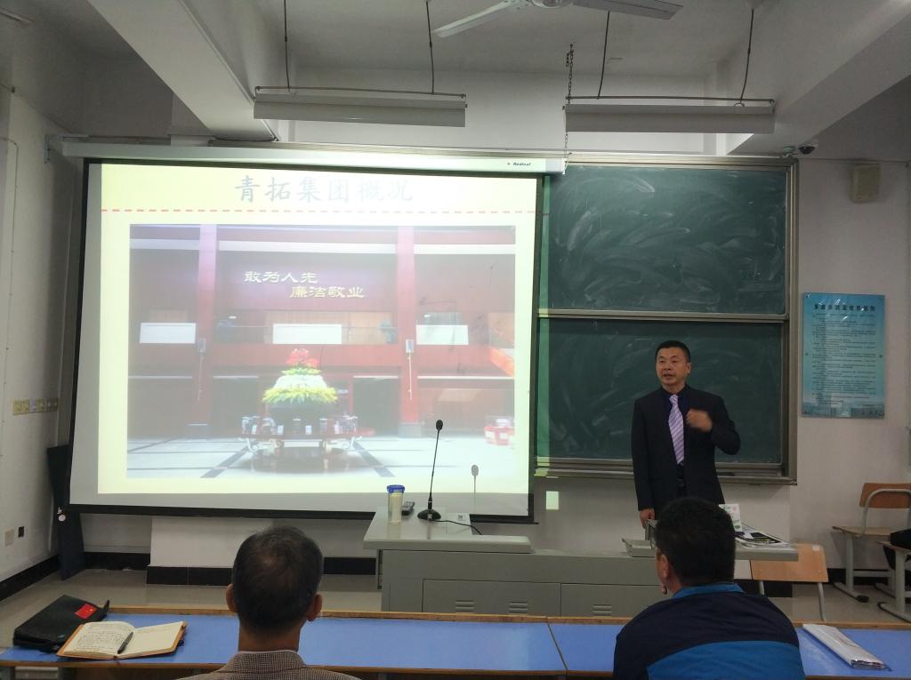 刘部长由习近平主席在“党的十九大”中对民营企业发展的支持与重视谈及青拓集团对“党的十九大”精神与内容的贯彻与落实,即讲座的第二部分:一、青山集团的发展史;二、青拓的发展概况;三、企业的发展规划图;四、企业的内部特色建筑及产业链。其中,刘部长着重强调了青拓集团的企业文化为“敢为人先,廉价敬业”,明确指出青山钢铁能在不足十年间由刚成立的钢铁制造产到“中国500强企业”排名靠前所依赖的恰是青山人不断创新,不断发展的精神以及青山人推崇的廉洁、敬业的品质。讲座的第三部分为大学生就业篇,刘部长伊始讲了大学生就业之前要先以学识充实自己的内部,事先了解企业的需求。之后,刘部长又提到三个小点:一、钢铁行业市场的发展概括,智者要善于从“危机”中获取“机遇”;二、大学生择业要“择己所长,择业所需”;三、青拓集团大学生培养计划。