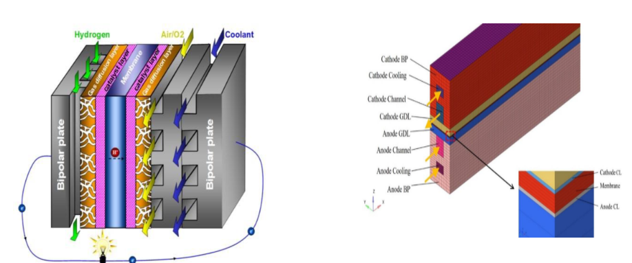 图1 PEMFC 工作原理示意                            图2 单流道PEMFC模型示意图