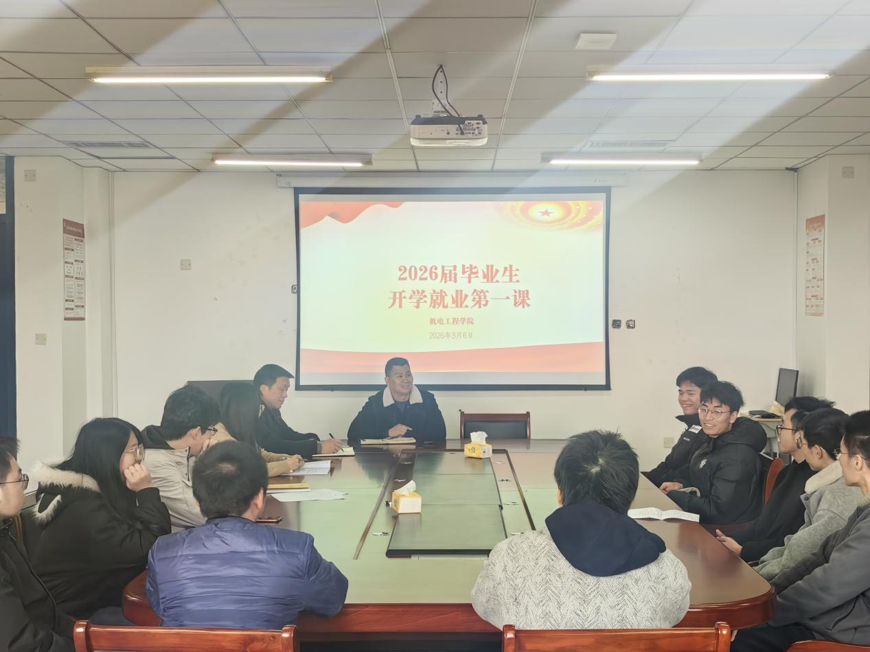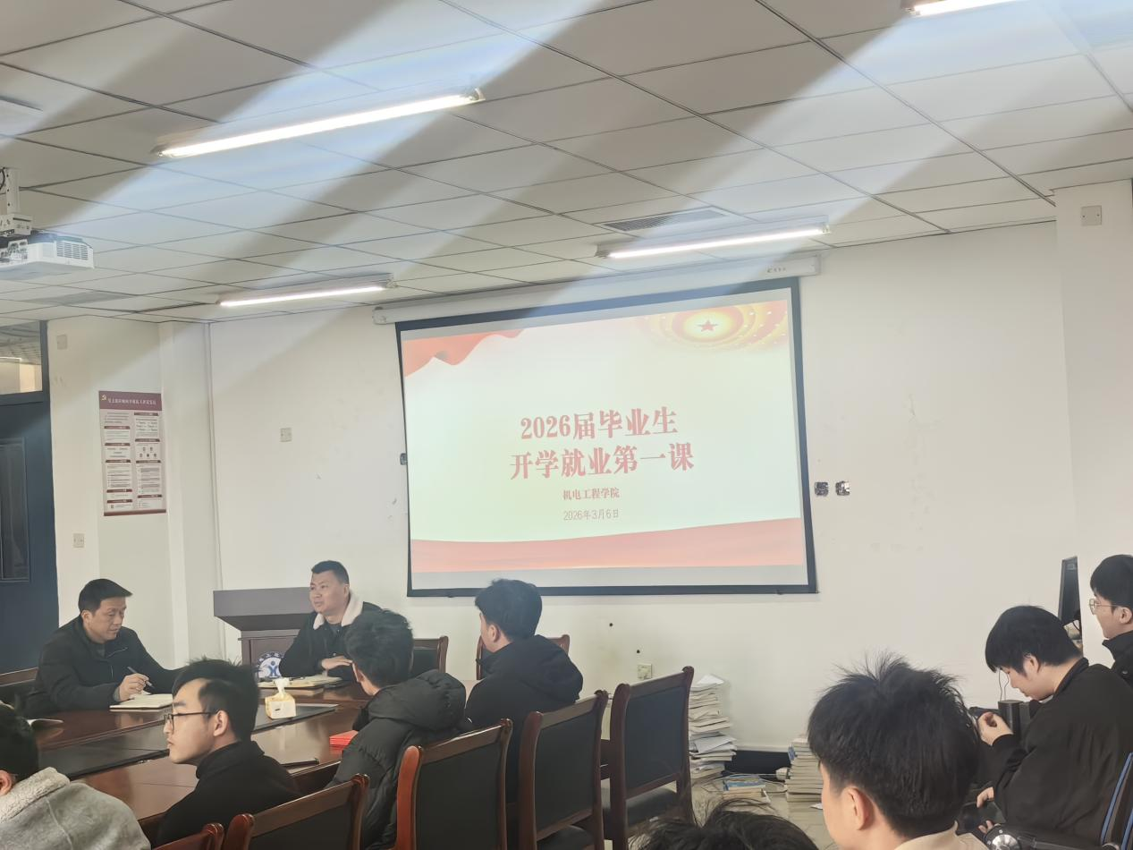 为抢抓春季招聘关键窗口期,引导毕业生树立正确就业观与择业观,全力推进2026届毕业生高质量充分就业,2026年3月6日机电工程学院为2026届毕业生讲授“就业第一课”。学院党委书记傅亮、副书记李建良主讲,毕业班辅导员全程参与。
