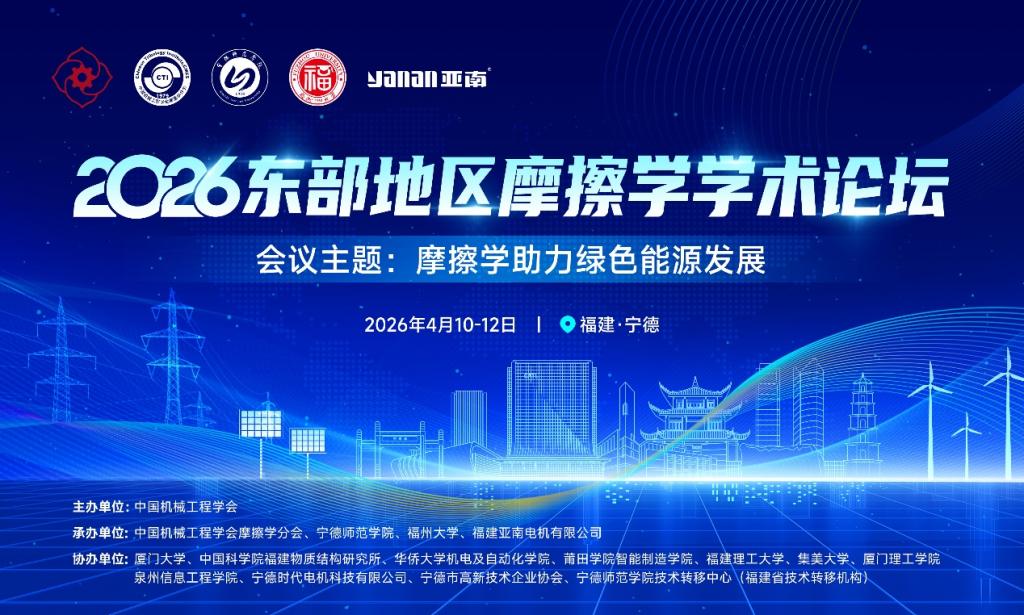 为推动我国东部地区五省一市(浙江省、山东省、江苏省、上海市、福建省、广东省)摩擦学科学技术的进一步发展,加强东部地区乃至全国摩擦学领域的交流与合作,中国机械工程学会将于 2026年 4 月10-12日在福建省宁德市举办“2026 年东部地区摩擦学学术论坛”,会议主题:摩擦学助力绿色能源发展。
